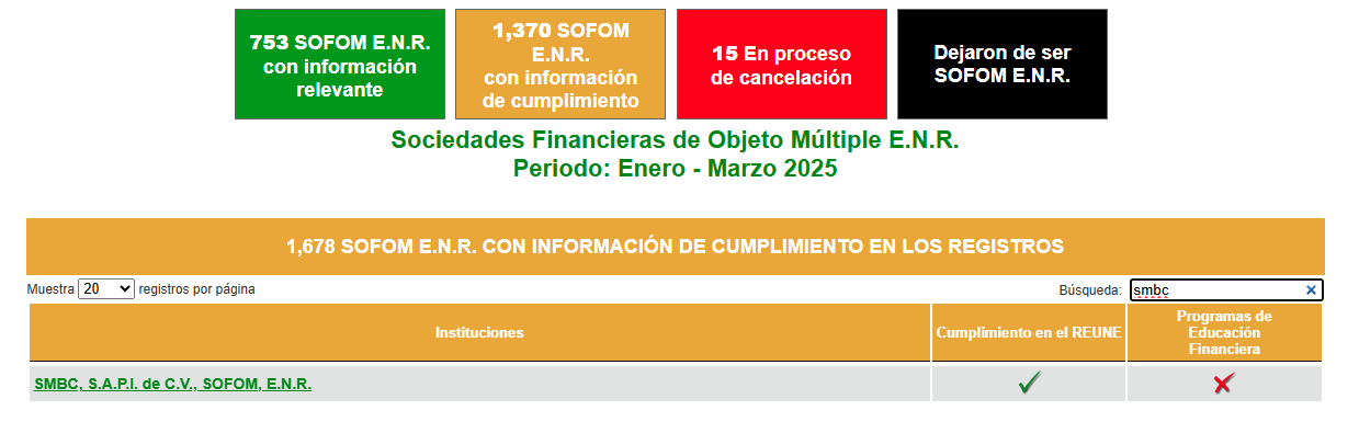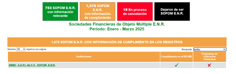 La información corresponde únicamente a SMBC, S.A.P.I. de C.V., SOFOM, E.N.R., para conocer la información de todo el sector al que corresponda, se podrá acceder al sitio http://www.buro.gob.mx